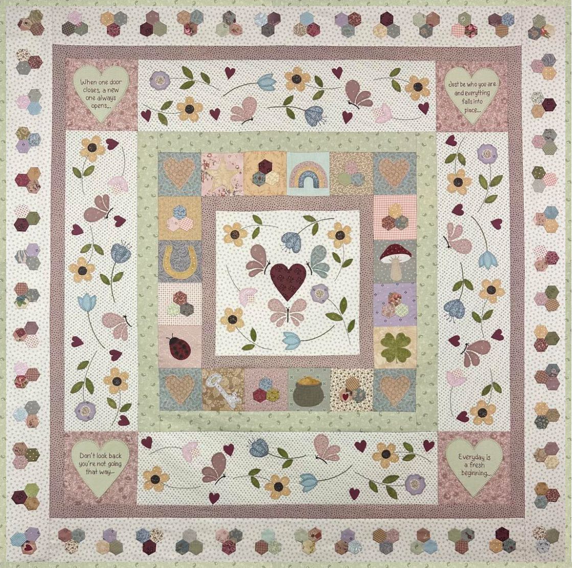 New Beginnings is a PDF downloadable quilt pattern including stitchery, applique and some gorgeous little hexagons. It is inspired by all things symbolizing new beginnings, new chapters and the different stages of life and looking forward to positive and wonderful things, wherever your path may lead you. A perfect finished size of 39.5" x 39.5".